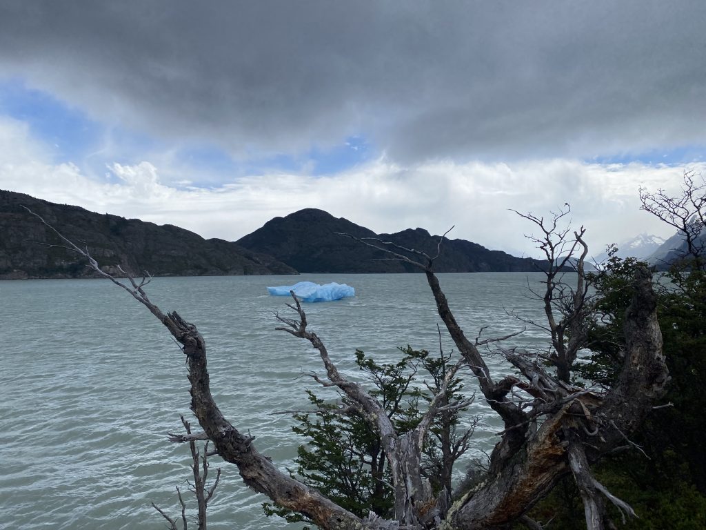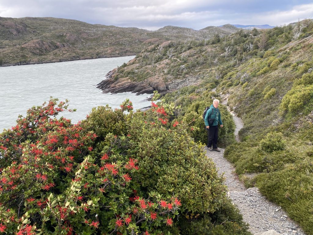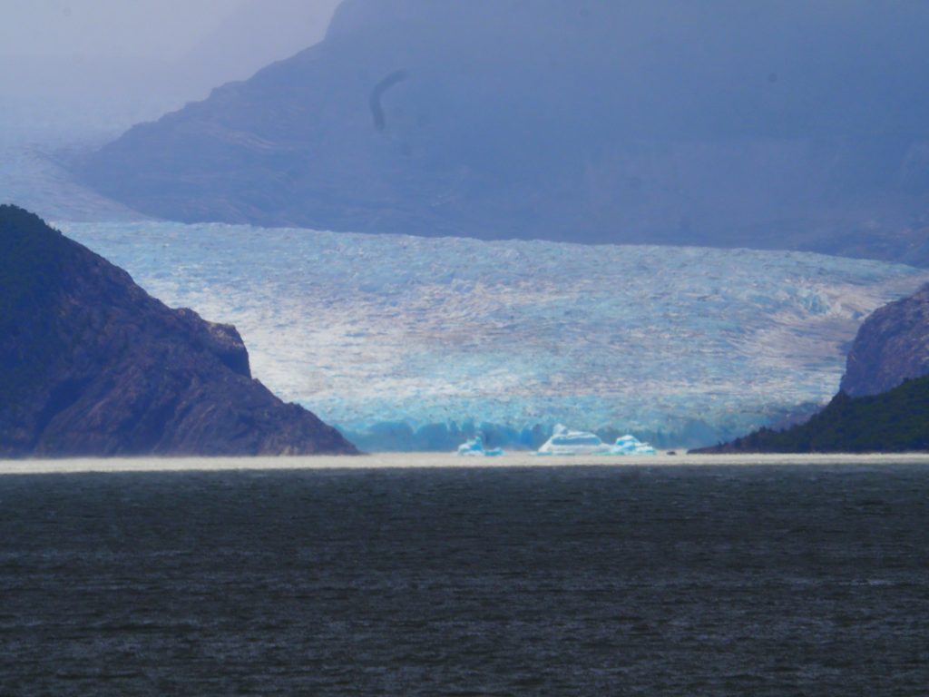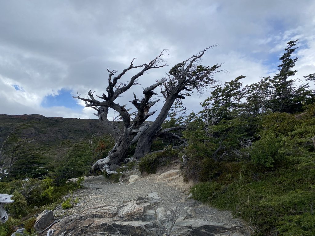 Heute fuhren wir in den Park zum Lago Grey (der ist tatsächlich als einziger See hier nicht blau oder grün ist, sondern grau). Eigentlich wollten wir eine Bootstour zum Gletscher und eine Wanderung auf einem Aussichtspunkt mit Blick auf den Gletscher machen. Aufgrund des Sturmes fuhr aber das Boot nicht und auch die meisten Wanderwege sind gesperrt. Bis zu einer Geschwindigkeit von 80 kmh gilt der Wind noch als moderat. Heute erreichten die Böen allerdings bis zu 120 kmh, da setzen dann die Sperrungen ein. Beim Autofahren führt das dazu, dass, wenn der Wind von hinten kommt, man die ganze Zeit den Staub, den das eigene Auto aufwirbelt, vor sich hat, da man ja höchstens 60 kmh auf der Schotterpiste fahren kann. Man wird also durch den Wind vom eigenen aufgewirbelten Staub überholt, echt verrückt!