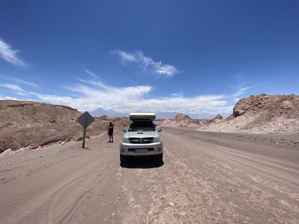 Der zweite Teil der Buchung des Valle de la Luna besteht eigentlich darin, dass man zum Sonnenuntergang zu einem bzw. zwei bestimmten Aussichtspunkten fahren und von dort aus selbigen anschauen darf, was ebenfalls sehr spektakulär sein soll. Als wir allerdings wieder am Eingang ankamen, wurde uns mitgeteilt, dass dies für den selbigen Abend nicht ginge, da einer ihrer Kollegen Covid-positiv getestet sei und nunmehr alle zum Test wollten, weshalb der gesamte Park für diesen Tag geschlossen werde. Das ganze hat den Kollegen allerdings nicht daran gehindert uns – ohne Maske – wortreich den gesamten Sachverhalt – in unser Auto hineinsprechend – zu erklären. Wir haben dann auch tatsächlich miterlebt, wie sämtliche Tourbusse (die offiziellen Tourbusse dürfen auch noch nach 16:00 Uhr nachmittags in den Park, wenn die Temperaturen angenehmer werden) zurückgeschickt wurden. Wie gesagt, es geht darum, mit einem Auto in einen Nationalpark einzufahren, dafür braucht es eigentlich gar kein Personal…; der Rest der Welt es nicht unbedingt unkomplizierter als Deutschland. Immerhin wurde unser Ticket auf einen anderen Abend umgeschrieben.
