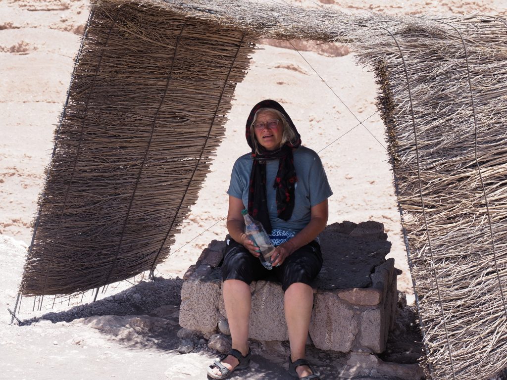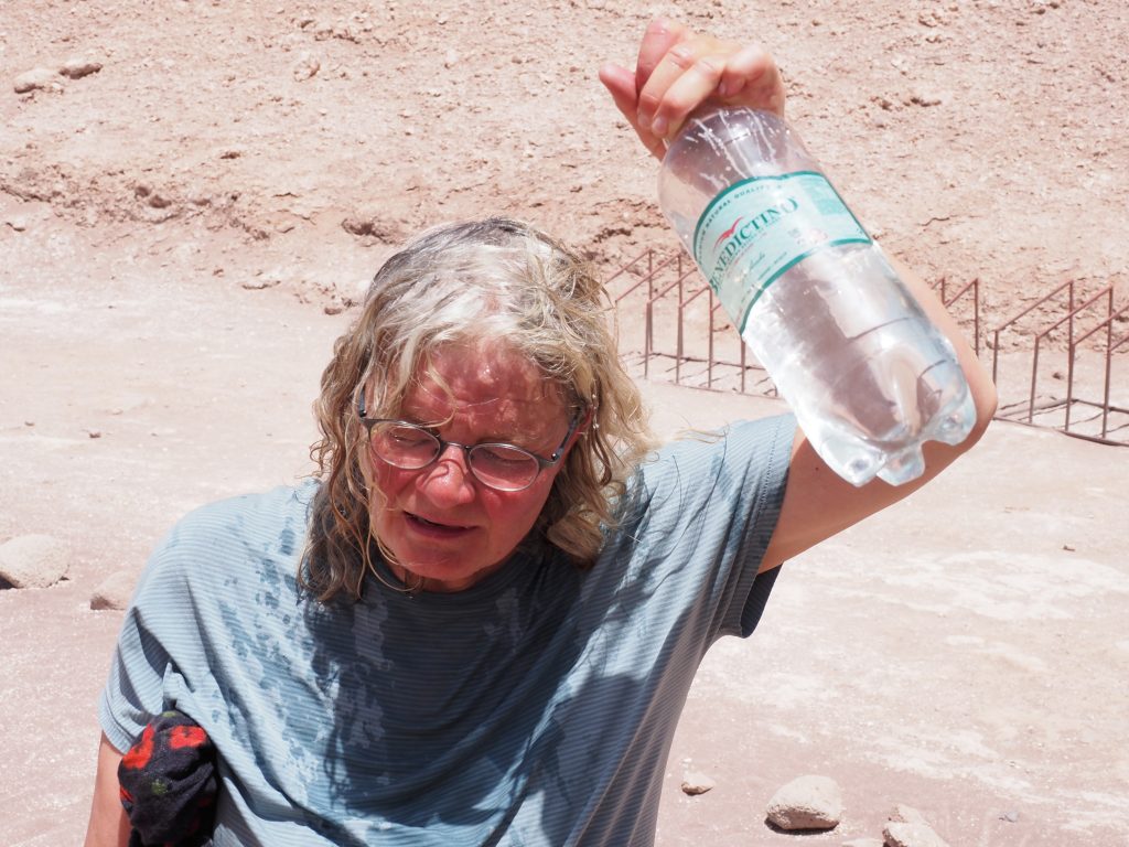 Da der erste Teil des Besuches einige doch längere Wanderungen (jedenfalls für die Verhältnisse bei 35° C im Schatten, den es nicht gibt) beinhaltet, wollten wir eigentlich früh los und waren auch gut in der Zeit, haben uns dann allerdings doch noch mit zwei Holländern verquatscht, die auch wegen Peru umplanen mussten und jetzt von hier auf einer sehr abgelegenen Route nach Uyuni in Bolivien fahren wollen. Die beiden – auch echt erfahrene Weltenbummler – hatten uns netterweise angeboten, uns mitzunehmen (die einzelnen Straßen finden sich nicht einmal auf unserer Landkarte), was wir aber abgelehnt haben, da die beiden schon am nächsten Tag los wollten und wir hier noch einige „Programmpunkte“ vor uns hatten.