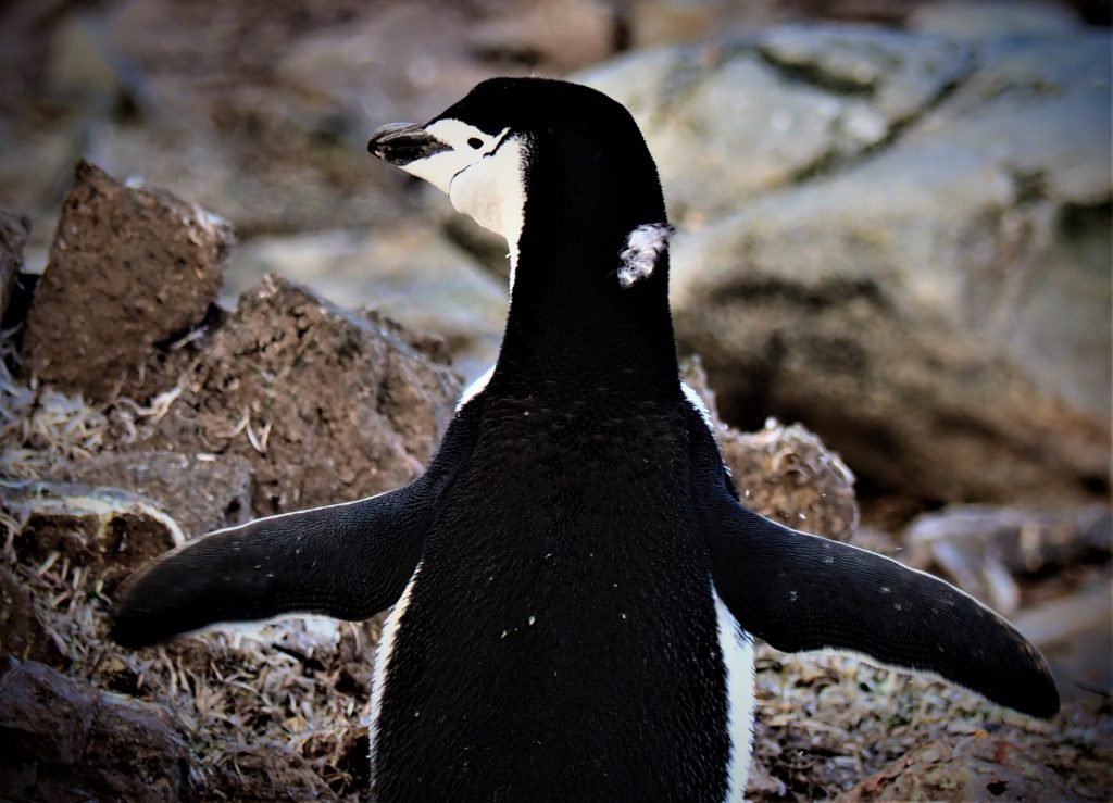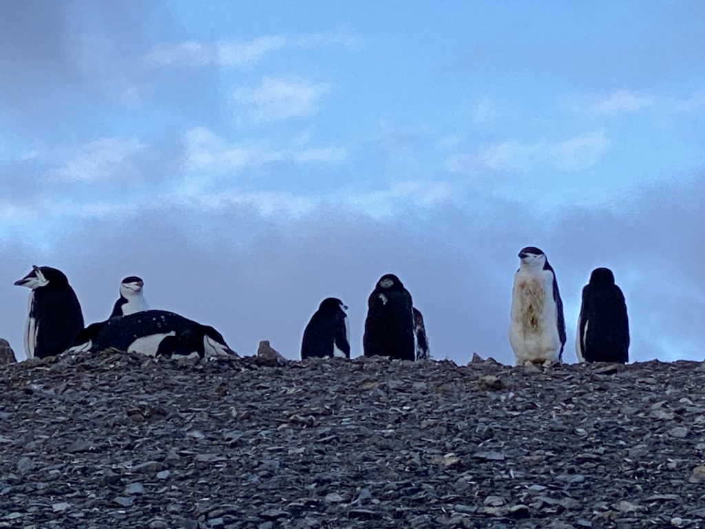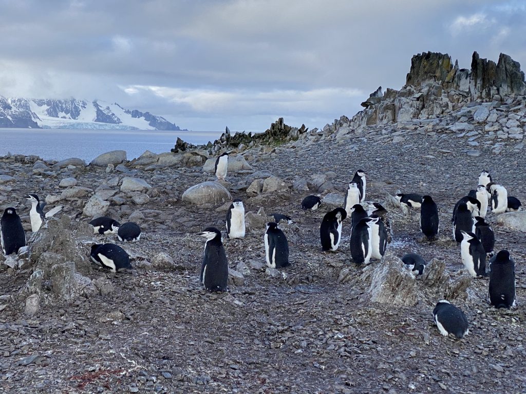 Nach einer kurzen Fahrt mit dem Zodiac gingen wir in der Halfmoon-Bay an Land. Dort war mit Hilfe von Bojen eine Route abgesteckt, auf der man sich bewegen darf (wegen des Mindestabstandes zu allen Tieren). Wir bekamen eine Stunde Zeit und liefen los. Überall liefen Pinguine umher und Robben lagen faul an Land. Bei den Pinguinen handelt es sich um Chinstrip-Pinguine und sie sehen zum Teil etwas gerupft aus, weil gerade alle Pinguine in der Mauser sind, um ihr Federkleid winterfest zu machen. Wir konnten sie ganz aus der Nähe bei allen möglichen Aktivitäten beobachten.
