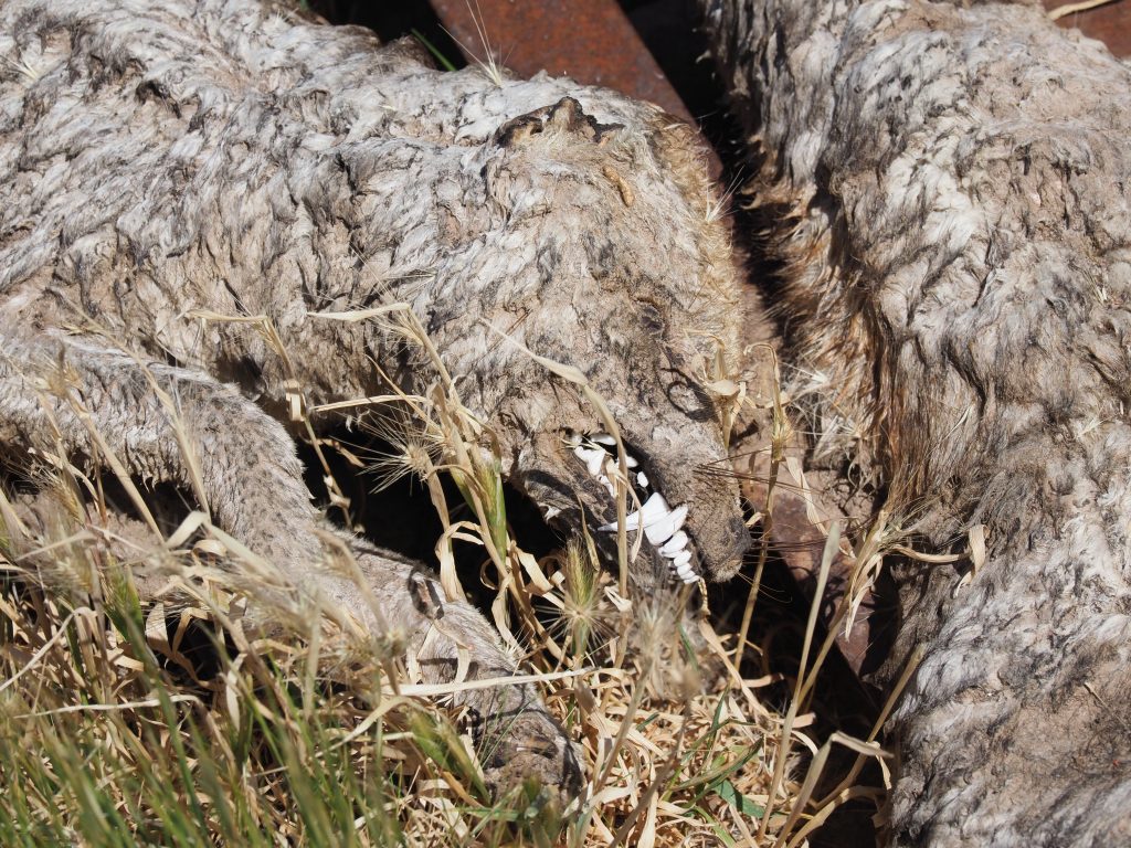 Nach einem entspannten Frühstück sind wir aufgebrochen, als gerade ein neuer Trupp „Seabridge PanAm-Fahrer“ auf den Campingplatz kam (jetzt haben wir wohl alle von denen gesehen, die ihre Autos auf demselben Schiff hatten). Nachmittags sind wir – nach zuletzt über 50 km Schotterpiste – im Monument Nacional Bosques Petrificado de Jaramillo angekommen, die Anfahrt war nicht so leicht, da die erste Strasse dorthin gesperrt war und am Tor auch noch ein Haufen toter – halb mumifizierter -Wildhunde o.ä. lag, echt gruselig.