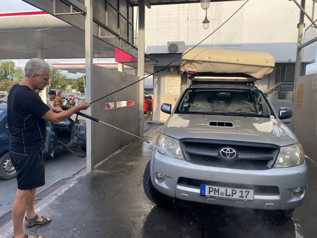 Heute beginnt der Abschied von den Anden. Wir kamen gegen Mittag los und fuhren vier Stunden nach Osten Richtung Catamarca, der Hauptstadt des gleichnamigen Bezirks. Endlich mal wieder eine richtige Stadt, in der wir einiges dringend zu erledigen hatten: Bargeld holen, Gasflasche auffüllen und einkaufen. Auf die Gasflasche mussten wir eine Stunde warten und nutzen die Zeit, um Chingi mal wieder richtig zu waschen, das hatte er mehr als nötig.