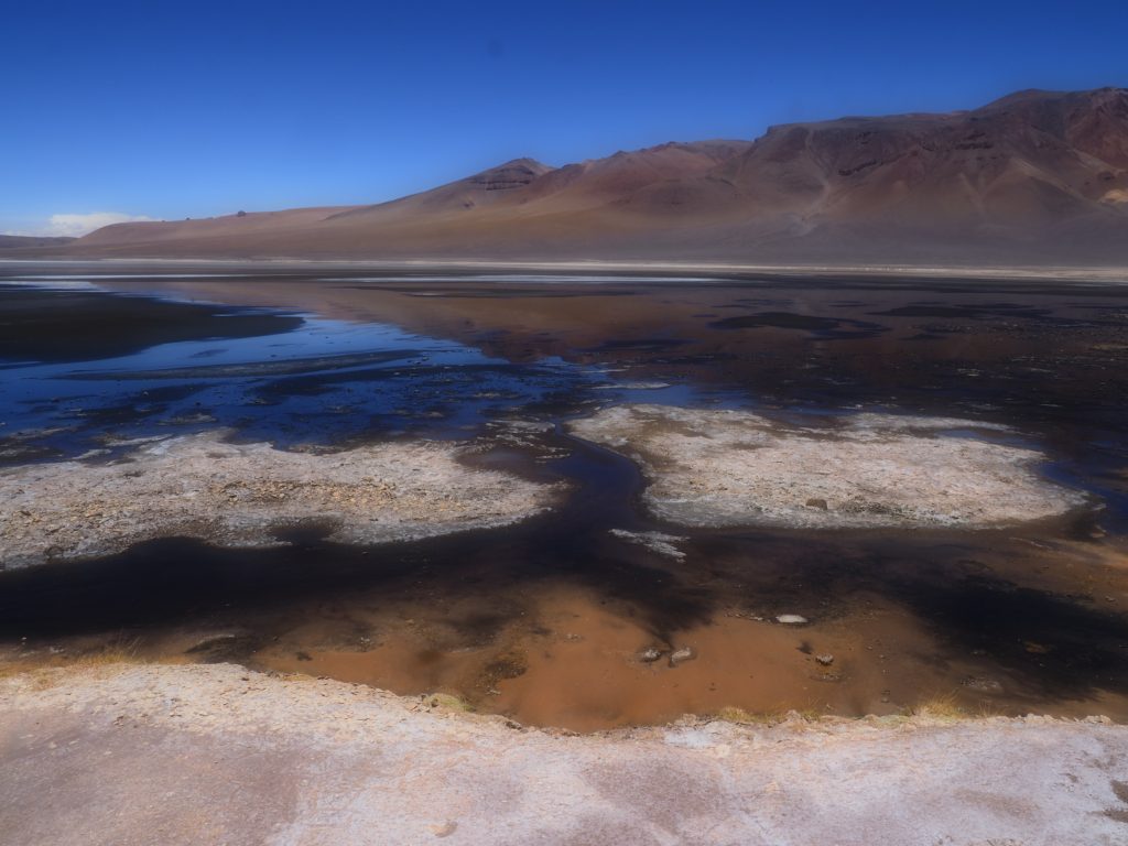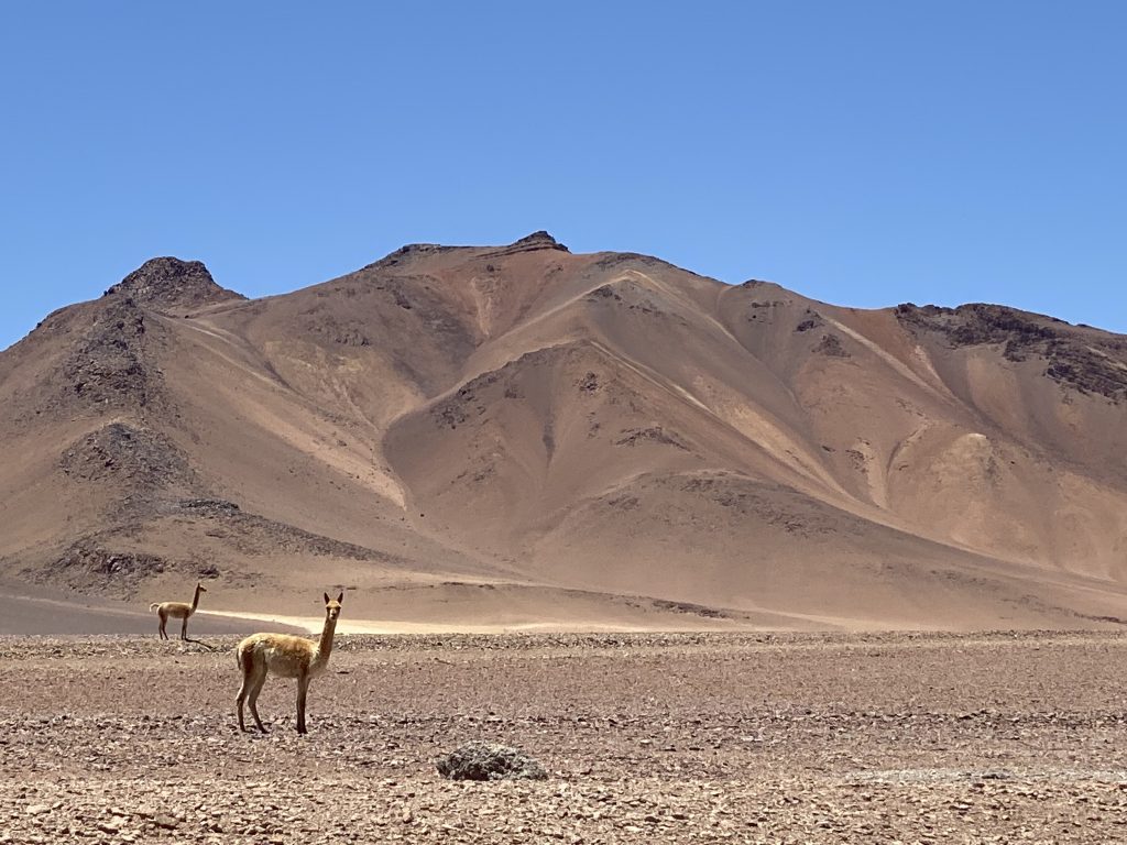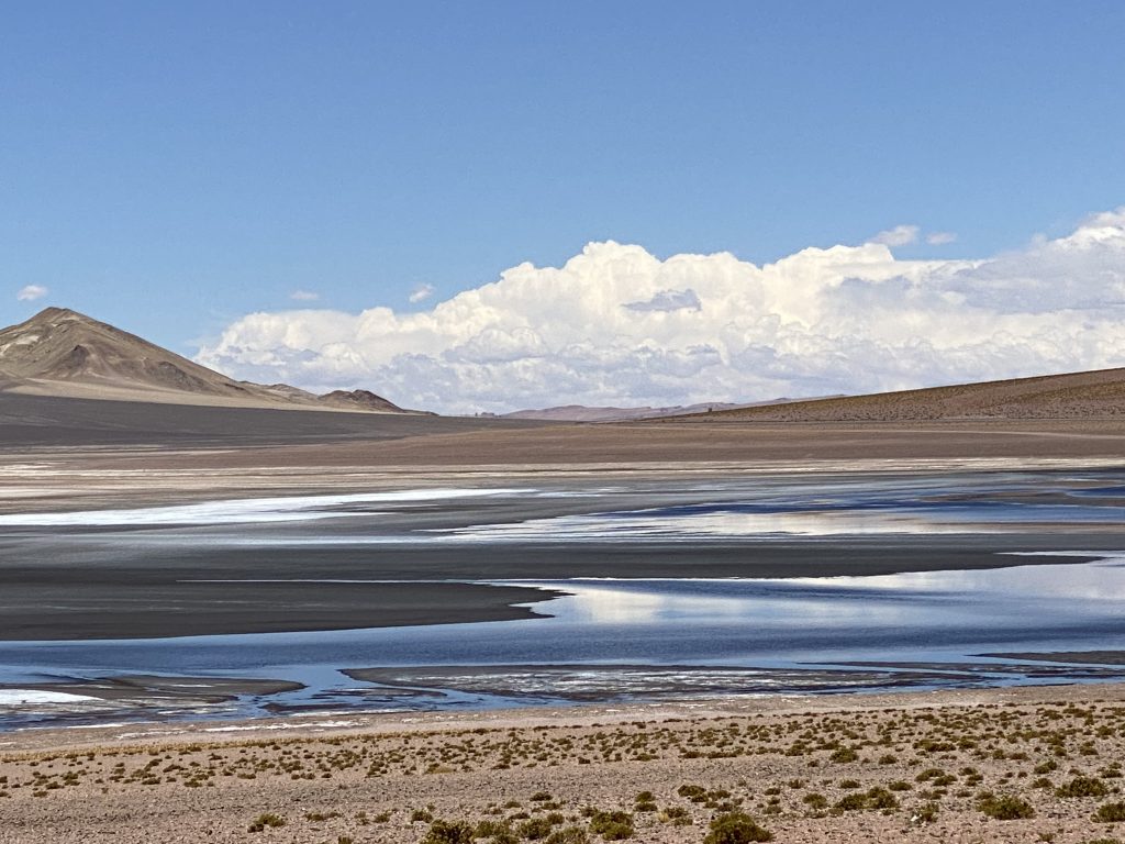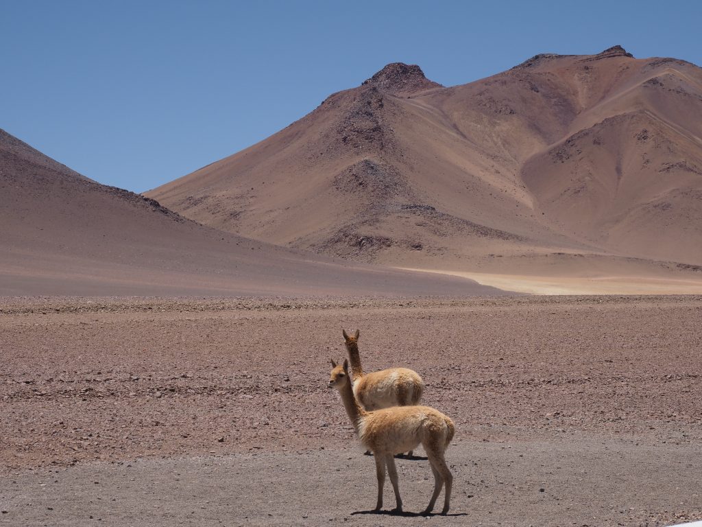 Heute morgen haben wir nach einem kurzen Frühstück abgebaut und sind schon um 11. 00 Uhr losgekommen. Wir verließen Acatama und fuhren Richtung Argentinien an einem Grenzposten zu Bolivien – wir hatten uns ja dagegen entschieden, über reine Schotterpisten über die sog. „Lagunenroute“ nach Uyunii zu fahren – vorbei zum Passo de Jama. Schon nach 20 km waren wir auf dem Altiplano in Höhe von 4200 m und das sollte auch die nächsten 120 km nicht weniger werden. Insgesamt fuhren wir über 300 km auf über 3000 m Höhe. Die Landschaft war überwältigend schön. Vulkane – 5000-6000m hoch erschienen einem, als könnte man eben hochlaufen – , bunte Berge, Wüste, dann wieder grüne Oasen, Salzseen, viele Vicun(j)as und auf 4200 m Höhe nochmal Flamingos.