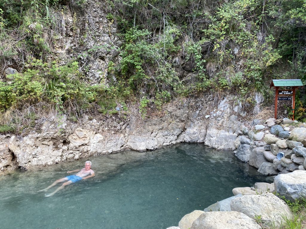 Nach einem Einkauf ging es dann zu den Thermas Los Poziones, die uns als besonders naturnah empfohlen worden waren. Es ist schwer sich zu entscheiden, in welche Therme man gehen will, da es um Pucon herum ca. 15 Stück gibt. Los Poziones war uns dann letztlich doch etwas zu naturnah, da es nicht mal Liegestühle oder Duschen gab. Und erst recht nicht das ersehnte Restaurant. Wir haben es dann aber trotzdem genossen in den verschiedenen warmen Becken herumzuliegen und am vorbeirauschenden Fluss zu sitzen.