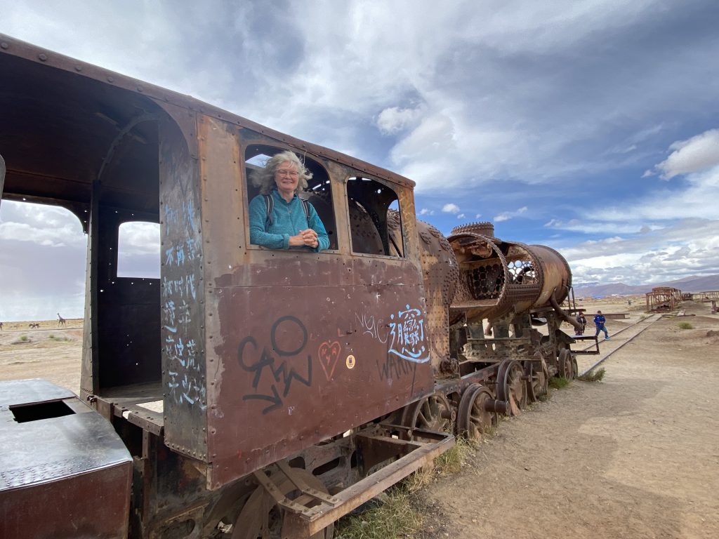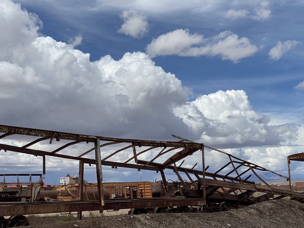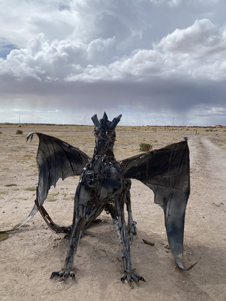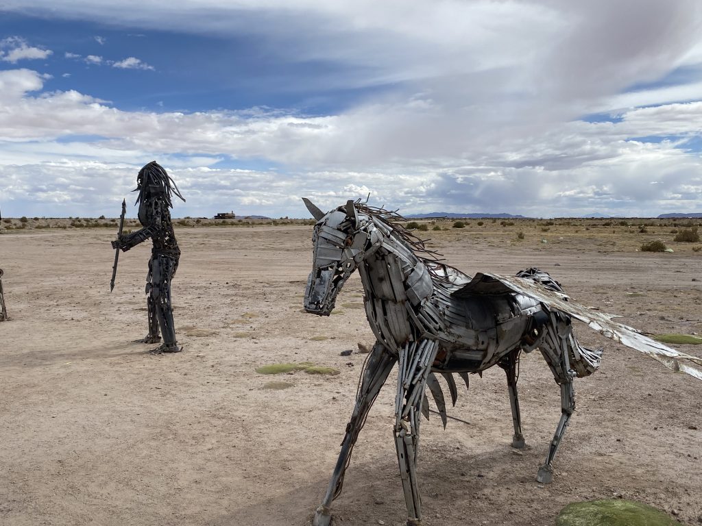 Mittags sind wir dann etwas essen gegangen und dann mit dem Taxi zum Friedhof der Züge gefahren, der einzigen Attraktion in der Stadt bzw. am Stadtrand. Diese alten Züge – die Züge wurden früher für den Salzabtransport genutzt – sind eigentlich noch gar nicht so alt, aber aufgrund des Salzes findet die Verwitterung beschleunigt statt. Diese verrosteten Züge in der Wüste würden gut in eine Westernkulisse passen. Immerhin gab es bei den Zügen noch ein paar geschweißte Metallskulpturen. Ansonsten ist diese Stadt wirklich unglaublich trostlos, zur trostlosen Western-Assoziaton würde noch passen, wenn ein paar Tumbleweeds (diese runden Büsche) über die staubigen Straßen rollen/wehen würden.