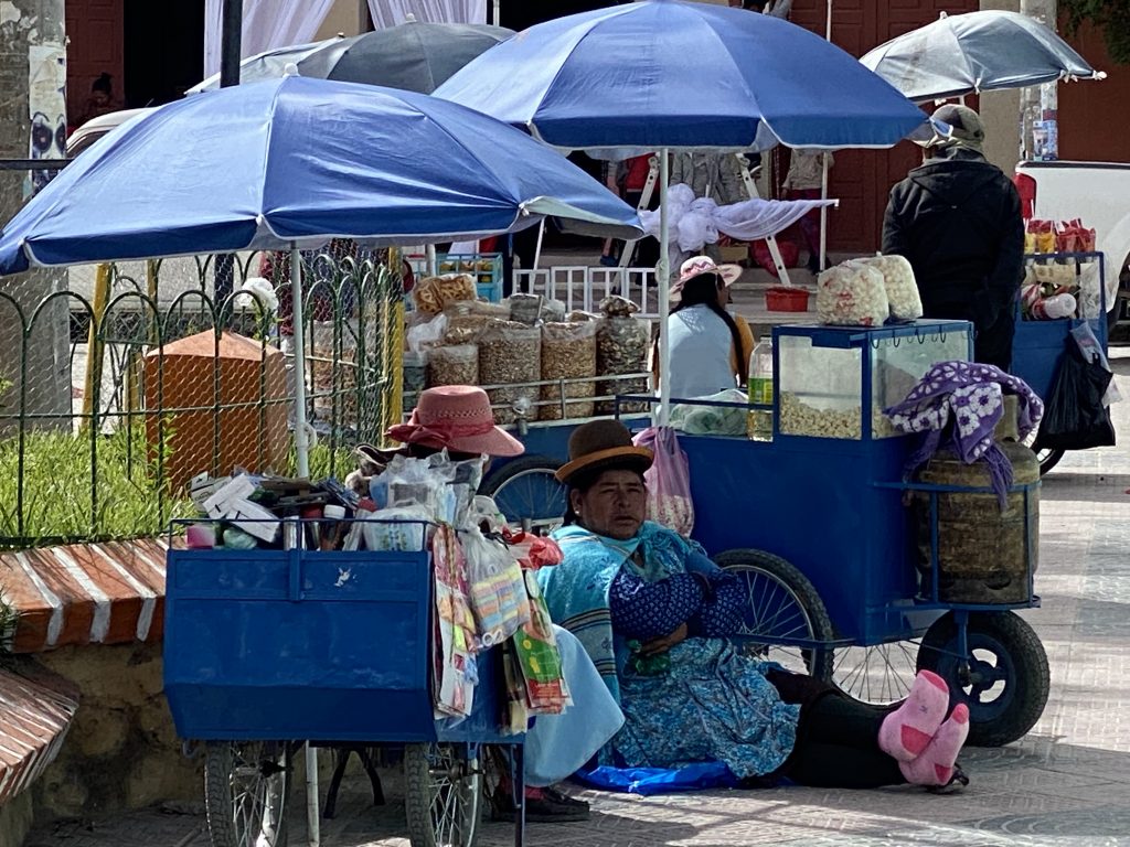 Exkus Coca: Coca spielt in Bolivien eine große Rolle. Quasi jeder hier hat eine dicke Backe, in der ein Cocaprim steckt und entsprechend wenig Zähne im Mund, sowie eine Plastiktüte voller Cocablätter. Anne hat neulich auch mal Coca in Form eines Bonbons probiert, weil es auch gegen die Höhenkrankheit hilft und in der Hoffnung, dass sie beim Autofahren weniger müde wird. Offensichtlich verträgt sie aber kein Kokain, jedenfalls har sie anschließend das erste Mal auf dieser Reise „Montezumas Rache“ heimgesucht, jedenfalls ist das inzwischen unsere Erklärung dafür, weil wir alles andere zusammen gegessen hatten. Außerdem schmeckt es wirklich schauerhaft, ein bisschen wie vergorenes Gras.