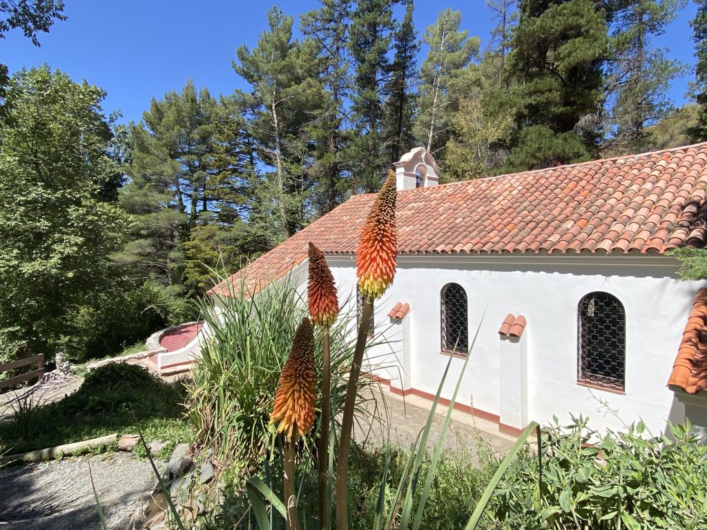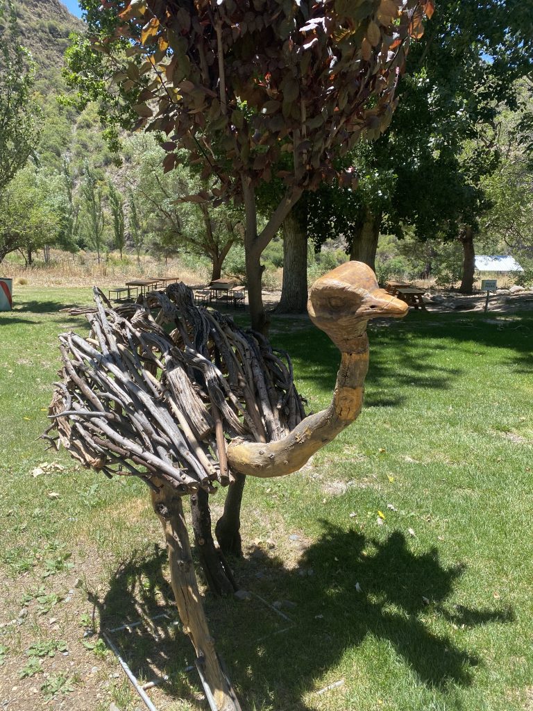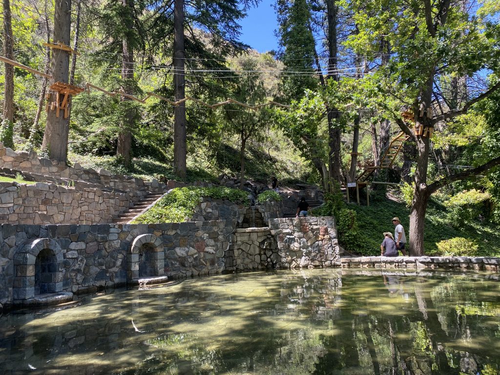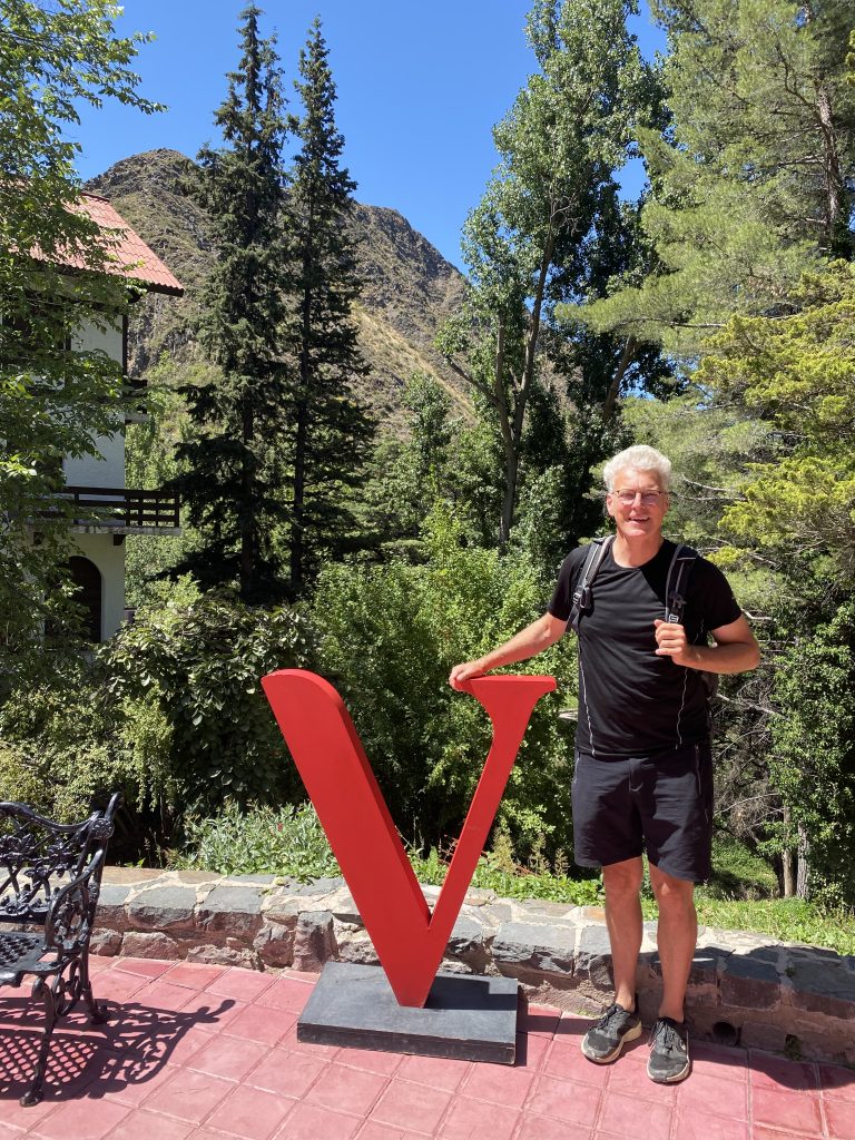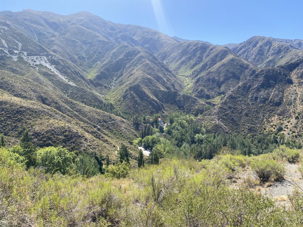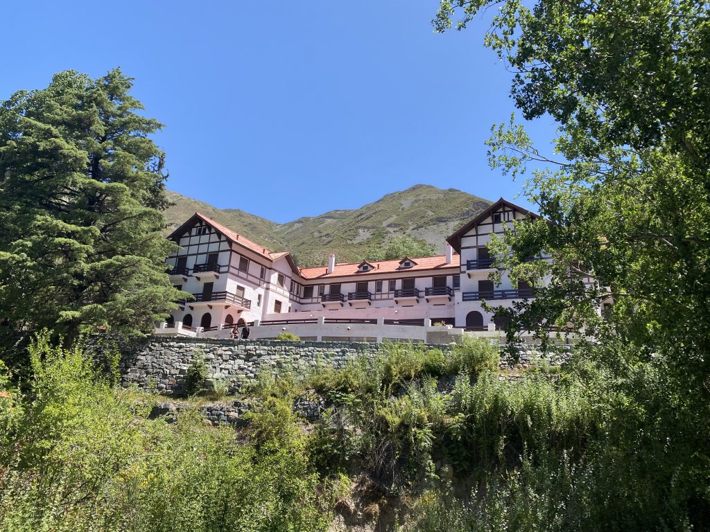 Zwei Kilometer weiter lag ein altes bzw. ehemaliges Hotel, das 1940 erbaut wurde und in dem jedes Badezimmer eine eigene Thermalquelle besaß. Heute ist das Hotel sowie der schön angelegte Garten inklusive Tennisplatz, Amphitheater und eigener Kapelle nationales Denkmal. Dazu gibt es noch einen Kletterpark und eine abenteuerliche Zipline. Nach einem kleinen Imbiss durchstreiften wir das Gelände, insbesondere den nach europäischem Vorbild mit vielen „internationalen“ Bäumen, Teichen und Wasserspielen angelegten Landschaftspark. Immer mal wieder zeigt sich, dass Argentinien mal eines der reichsten Länder war, es war schon noch eine besondere Atmosphäre zu spüren. Anschließend fuhren wir mit Chingi über eine sehr steile Schotterpiste – es ist die alte Strasse quer durchs Gebirge nach Uspallata (da waren wir auf dem Weg vom Andenpass durchgekommen)- aber nur bis zu einem Aussichtspunkt.