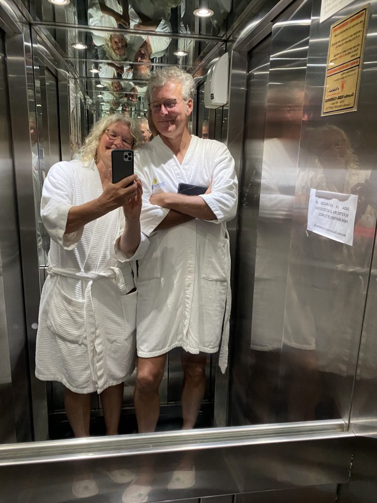 Weil es uns gestern so gut in der Therme gefallen hat, haben wir für heute wieder ein „Paket“ gebucht. Eigentlich wollten wir nur in das Thermalschwimmbad, das geht – die Gründe haben wir nicht genau verstanden, in den Spa konnten wir ja auch, ohne formale Hotelgäste mit Zimmer zu sein – aber nur, wenn man Gast im Hotel mit Zimmer ist. Deshalb muss man für ein paar Stunden einchecken, bekommt ein Zimmer, kann ins Thermal-Schwimmbad und zusätzlich in den Spa und bekommt ein Mittagsmenü.