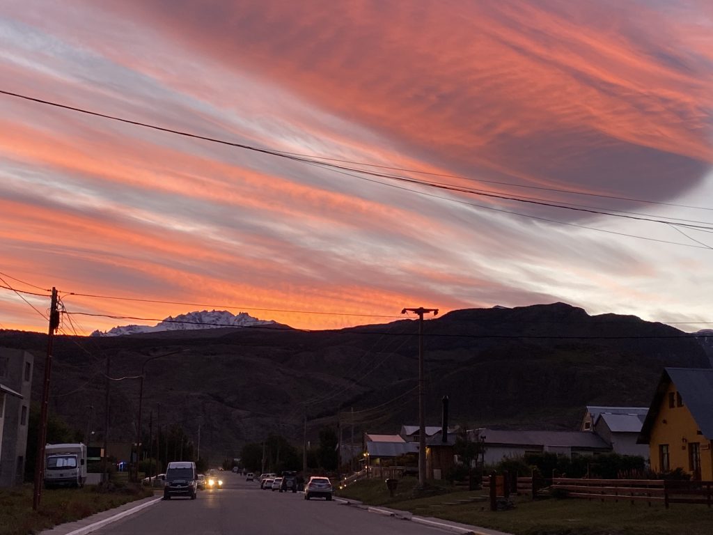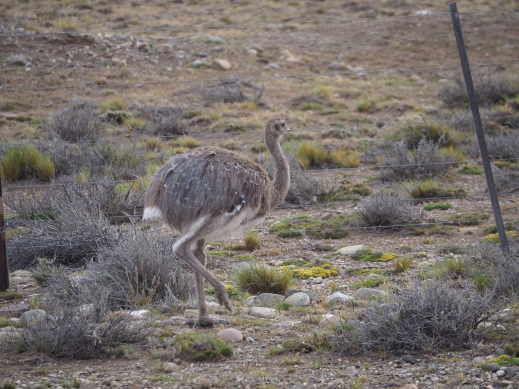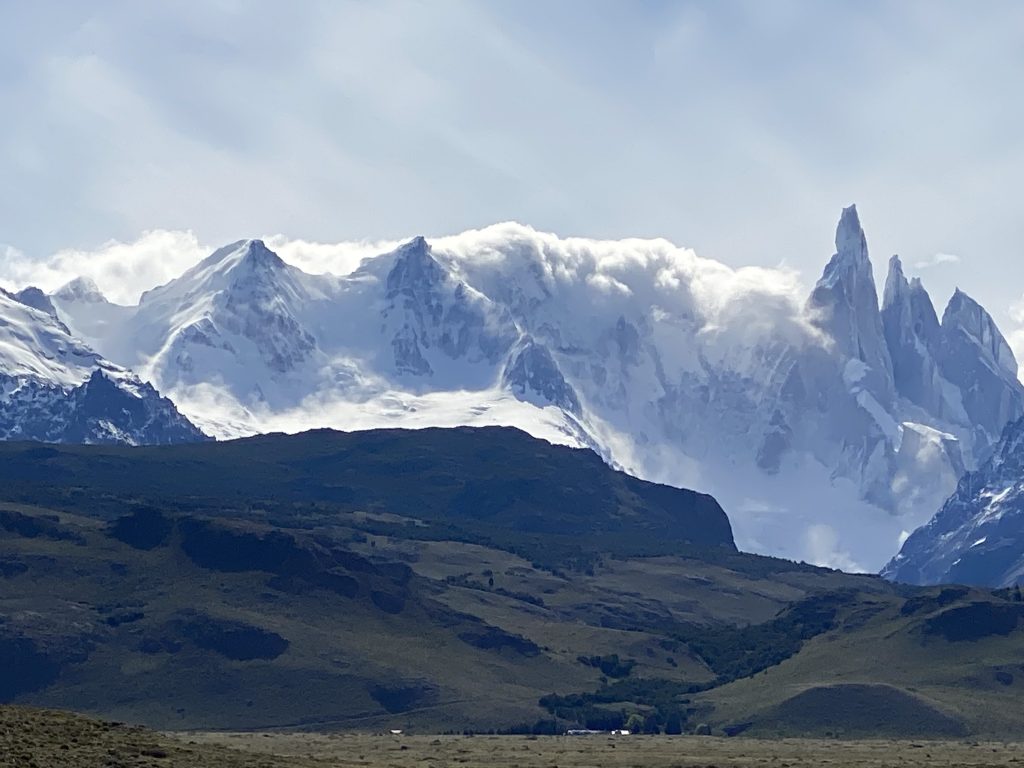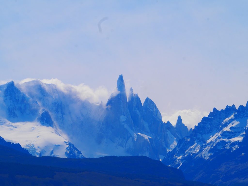 Um 14.00 Uhr kamen wir dann endlich los. Wir fuhren durch eine fantastische Landschaft. Braune Pampa bis zum Horizont, aber dazwischen türkisfarbene Seen und Flüsse. Die letzten 100 km fuhren wir auf das gewaltige Bergmassiv Fitz Roy mit seinen schneebedeckten Bergen und den spitzen Torres zu, ein fantastischer Anblick, zumal es die ganze Zeit entlang des türkisen Lago Viedma ging. Um 17.00 Uhr erreichten wir El Chaltén mitten im Nationalpark. Wie wir schon wussten, gibt es hier unverständlicherweise keinen Campingplatz, aber wir fanden einen Platz im Hof eines Hostals. Hier konnten wir unser Dachzelt aufstellen und die Angenehmlichkeiten des Hostals (Duschen und Küche) nutzen. Erstmal brachen wir aber noch zu einer kleinen Wanderung zum Mirador de Condor auf. Neben einem tollen Blick auf die Stadt und die Berge sahen wir auch tatsächlich wieder einen Condor. Wirklich beeindruckend, hat er doch eine Spannweite von knapp 3m.