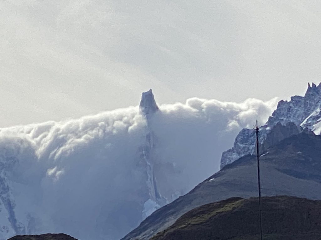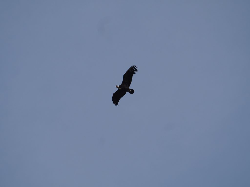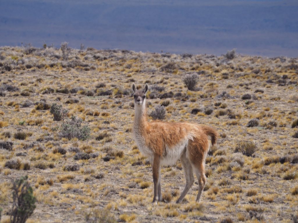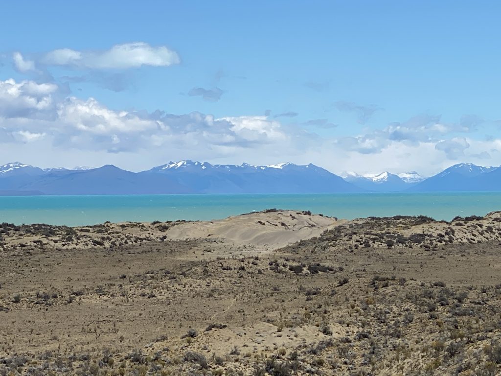 Um 14.00 Uhr kamen wir dann endlich los. Wir fuhren durch eine fantastische Landschaft. Braune Pampa bis zum Horizont, aber dazwischen türkisfarbene Seen und Flüsse. Die letzten 100 km fuhren wir auf das gewaltige Bergmassiv Fitz Roy mit seinen schneebedeckten Bergen und den spitzen Torres zu, ein fantastischer Anblick, zumal es die ganze Zeit entlang des türkisen Lago Viedma ging. Um 17.00 Uhr erreichten wir El Chaltén mitten im Nationalpark. Wie wir schon wussten, gibt es hier unverständlicherweise keinen Campingplatz, aber wir fanden einen Platz im Hof eines Hostals. Hier konnten wir unser Dachzelt aufstellen und die Angenehmlichkeiten des Hostals (Duschen und Küche) nutzen. Erstmal brachen wir aber noch zu einer kleinen Wanderung zum Mirador de Condor auf. Neben einem tollen Blick auf die Stadt und die Berge sahen wir auch tatsächlich wieder einen Condor. Wirklich beeindruckend, hat er doch eine Spannweite von knapp 3m.
