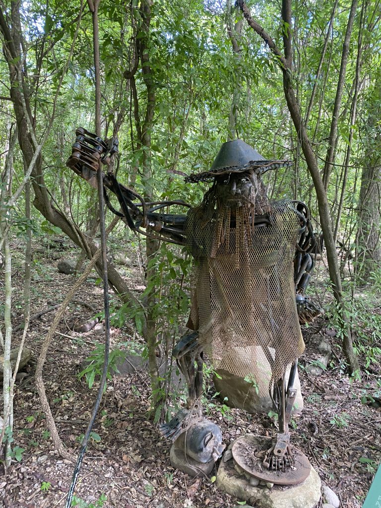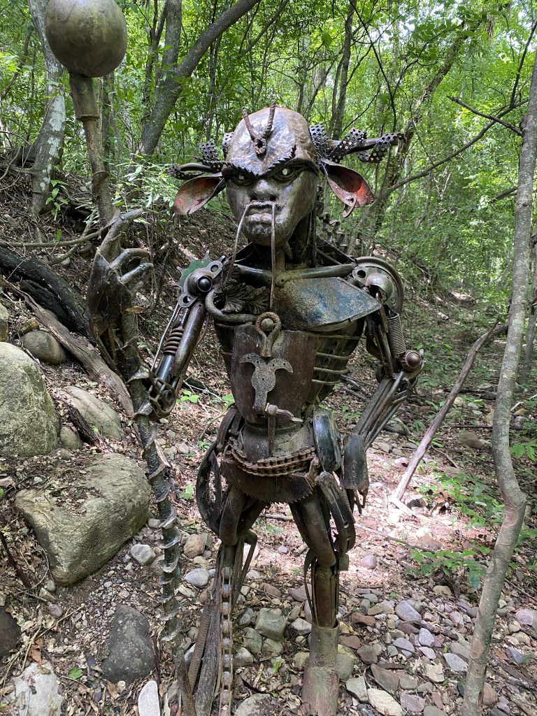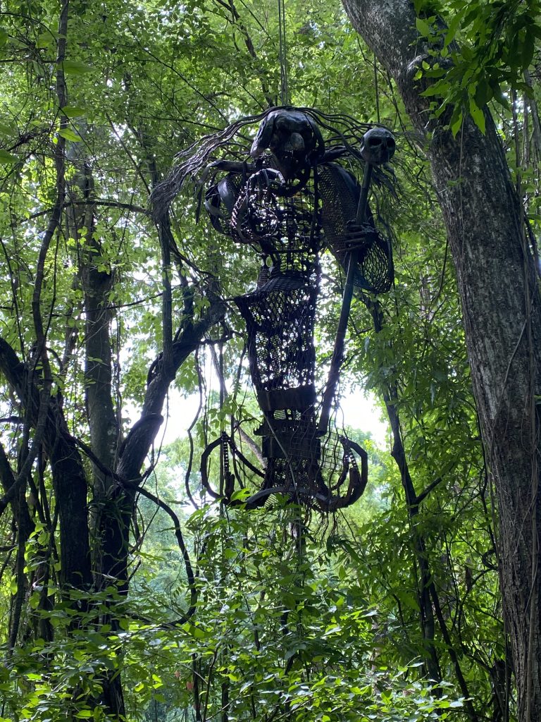 Trotzdem machten wir uns tapfer auf den Weg zum ersten Trail. Dort waren viele verschiedene Metallfiguren im Wald, die aus der Mythologie der Ureinwohner stammen. Wir fuhren dann weiter und machten noch weitere Trails, einen sehr weit runter zu einem Fluss. Der Wald und die Atmosphäre war wirklich sehr beeindruckend, überall Lianen, Flechten und unendlich viel Grün. Der Regenwald, hier „Yungas“ genannt liegt an der östlichen Abbruchkante der Anden und reicht vom Norden Perus, über Bolivien bis in den Norden Argentiniens hinunter, eine wirklich faszinierende Landschaft! Leider sahen wir kaum Tiere, auf die wir sehr gehofft hatten, insbesondere weder Tucan noch Tapir, ist halt kein Zoo. Leider gab sehr viele Mosquitos, da wir uns aber vorher erkundigt hatten, dass keine Malariagefahr besteht, nahmen wir es recht gelassen hin.