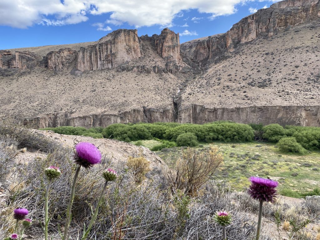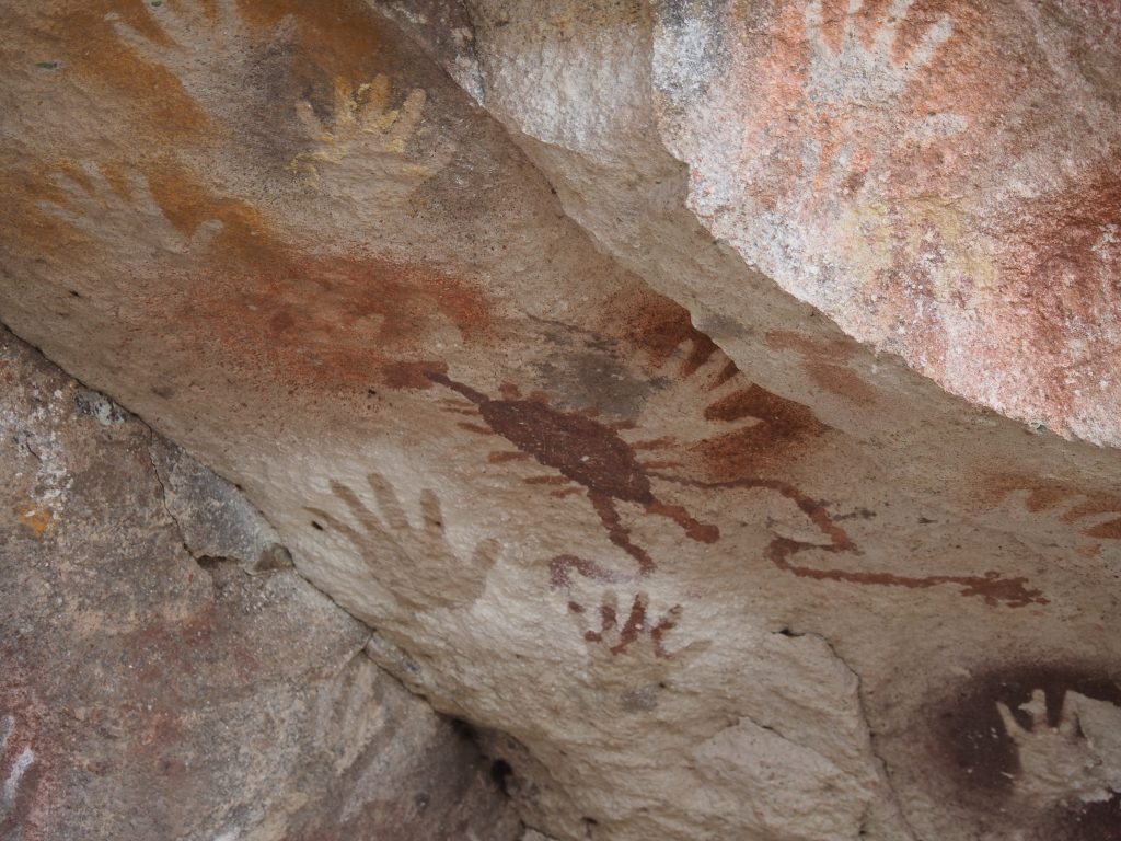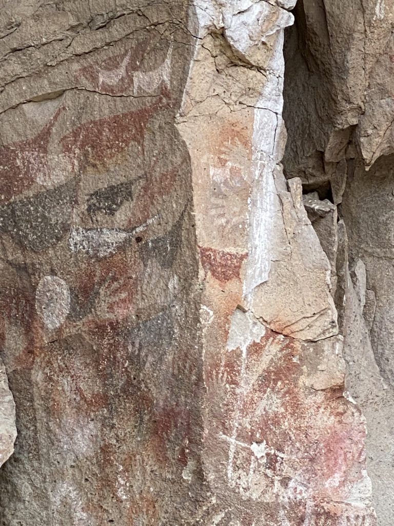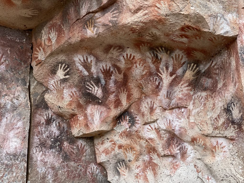 Exkurs: Cuevas de los Manos (Höhlen der Hände): Die Cuevas sind keine richtigen Höhlen, sondern eher überhängende Felsen in einer Schlucht des Rio Pinturas. Diese waren von ca. 9500 v. Chr. bis 1000 n. Chr. bewohnt. Die Ureinwohner nutzen diese Höhlen als Sommerquartier. Hier war ein idealer Ort mit Süßwasser vom Fluss und vielen Guanakos, von denen sie alles bezogen was sie brauchten (Fell, Wolle, Fleisch, Knochen). Sie hinterließen hier zahlreiche Malereien, die ältesten menschlichen Zeugnisse in Südamerika. Neben den Zeichnungen von Jagdszenen entstanden vor allem viele Negativ-Handabdrücke. Damit kennzeichneten die Familiengruppen vermutlich, dass sie diese Höhlen genutzt hatten und im nächsten Sommer wiederkommen würden. Sie nutzten den hohlen Knochen eines Baby-Nandus als Blasrohr, um damit Farbe um die Hände herum zu blasen. Das erklärt auch, warum es sich zu 90 Prozent um linke Hände handelt, da Rechtshänder wohl mit der rechten Hand das Blasrohr hielten. Interessant ist auch, dass es auffällig viele missgestaltete Hände gibt, mit zu wenigen oder zu vielen Fingern. Dies wird auf die Inzucht innerhalb der Familienclans zurückgeführt. Die Farben wurden aus Fett, Blut und Mineralien gemischt. Sie haben so gut gehalten, weil einerseits der Fels so beschaffen ist, dass er die Farbe quasi aufgesaugt hat, zum anderen waren die überhängenden Felsen vor Wind und Regen gut geschützt.