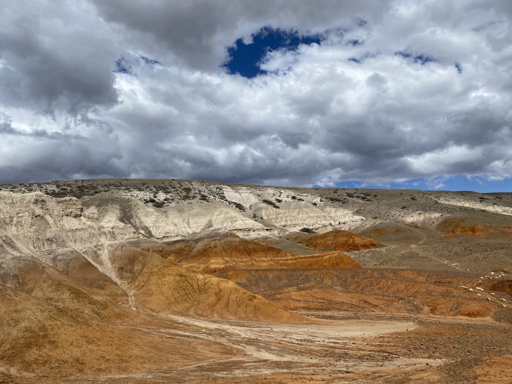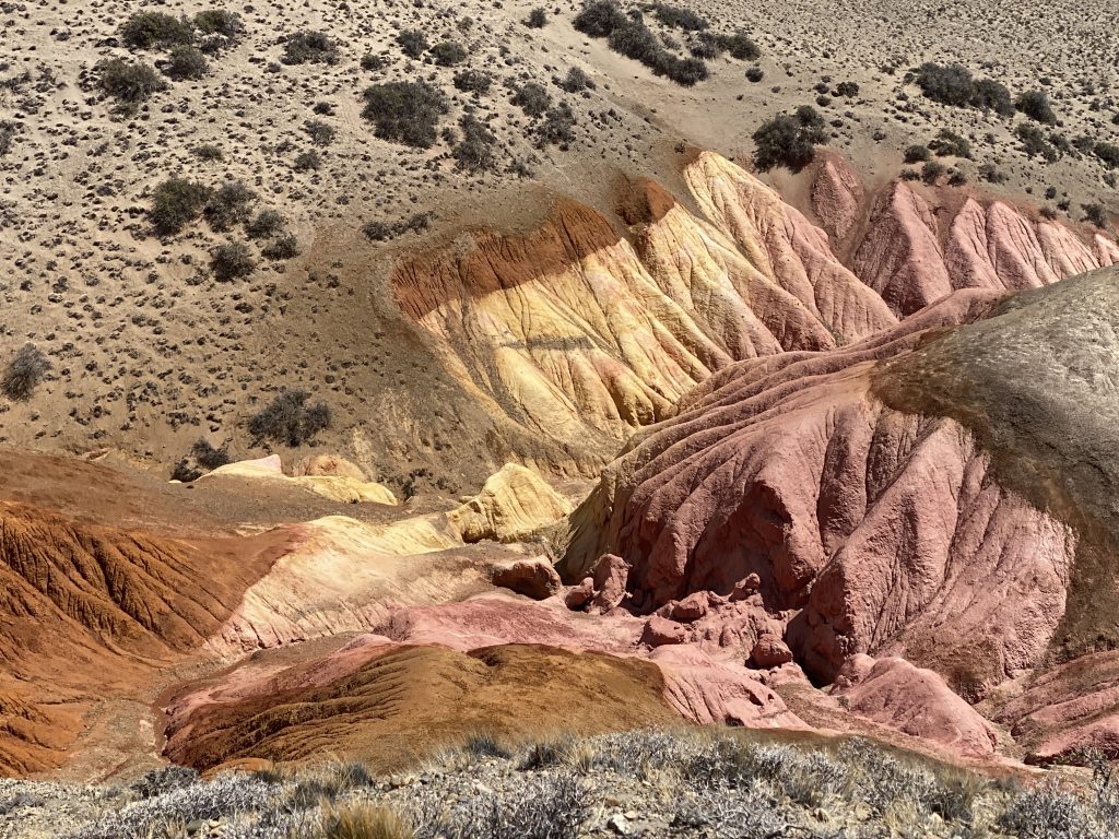 Nachdem wir noch Kaffee und Hotdogs spätstückten und nochmal das WLAN zu Telefonaten nutzen, sind wir eine sehr steile Straße wieder zurück zur Ruta 40 gefahren (siehe Video). Nach einer kurzen Fahrt kamen wir zum Regionalpark Canyandon de Peinturas. Dort machten wir eine 5km lange Wanderung durch den Canyon der Farben. Die verschiedenen Farben der Felsen von grau, ocker, braun, rot, rosa, violett bis zu gelb sahen einfach toll aus und Steffen geriet wieder in Fotorausch. Unschön war allerdings, dass auf dem Boden tausende von sehr großen heuschreckenähnlichen Insekten herum sprangen, die aufgrund des starken Windes ziellos durch die Gegend taumelten. Dafür kam mal wieder unser Freund der Condor vorbei.