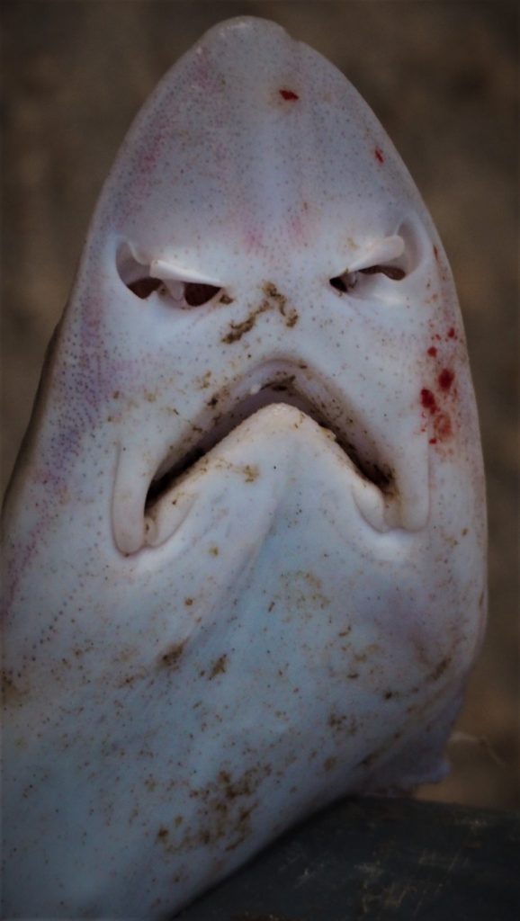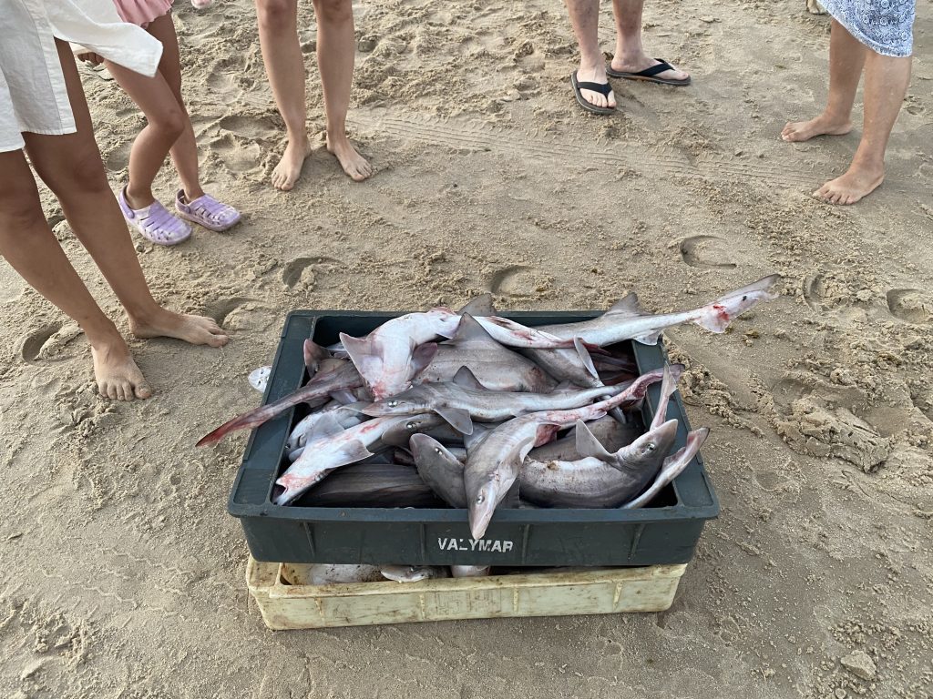 Tatsächlich gefiel es uns auch ausgesprochen gut. Wir kauften Fisch, aßen Eis und gingen lange im wirklich warmen Atlantik mit super Wellen baden. Abends kam noch ein Fischerboot herein, das wirklich bis oben mit Fang (alles junge Katzenhaie) beladen war und im Abendlicht mit einer Pferdekutsche entladen wurde, weil es zu schwer war, so an den Strand gezogen zu werden, sehr malerisch.